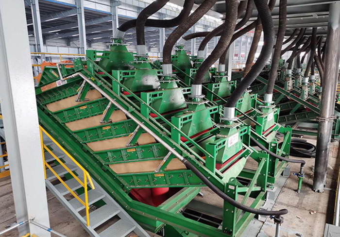處理量更大,篩分效率更高;篩機(jī)整機(jī)采用聚脲噴涂技術(shù),保證設(shè)備長期使用的防腐性;立式擠壓式喂料結(jié)構(gòu),使每層礦漿均勻分布在每層篩網(wǎng)的整個(gè)寬度上;采用中心給料,內(nèi)部溢流分料,確保每路給料均勻等量,節(jié)約空間。